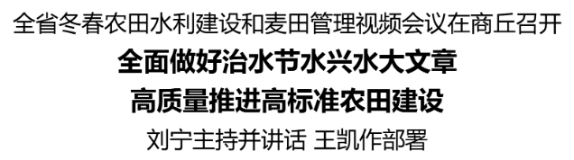 12月6日,全省冬春农田水利建设和麦田管理视频会议在商丘召开,省委书记刘宁主持并讲话,强调要深入贯彻党的二十届四中全会精神,学习领会习近平总书记关于治水、关于“三农”工作的重要论述和在河南考察时重要讲话精神,按照全国冬春农田水利暨高标准农田建设视频会议部署和省委十一届十次全会要求,攻坚克难、真抓实干,开创水利建设和“三农”工作新局面。省长王凯作工作部署。